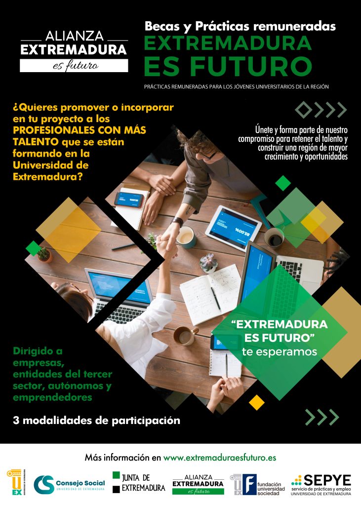 El Programa de Becas y Prácticas remuneradas, perteneciente al Eje I de la Alianza Extremadura es futuro, lanza su quinta edición, impulsado por el Consejo Social de la Universidad de Extremadura y la Fundación Universidad-Sociedad, con la colaboración del Servicio de Prácticas y Empleo de la UEx.